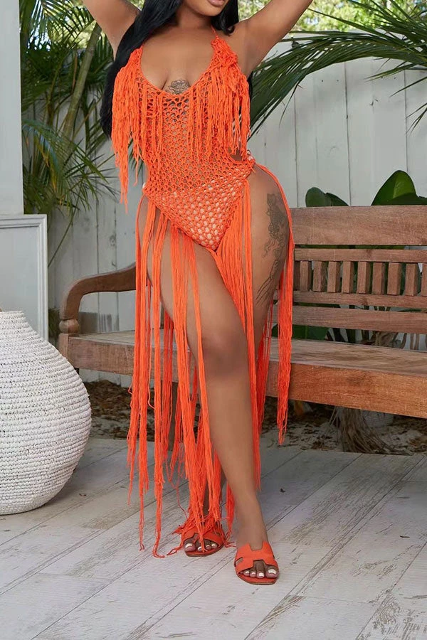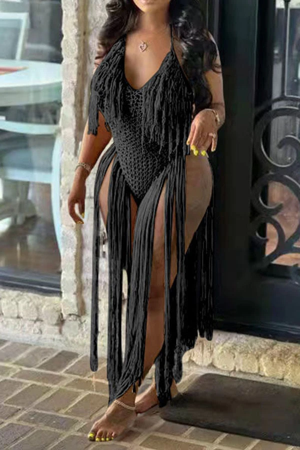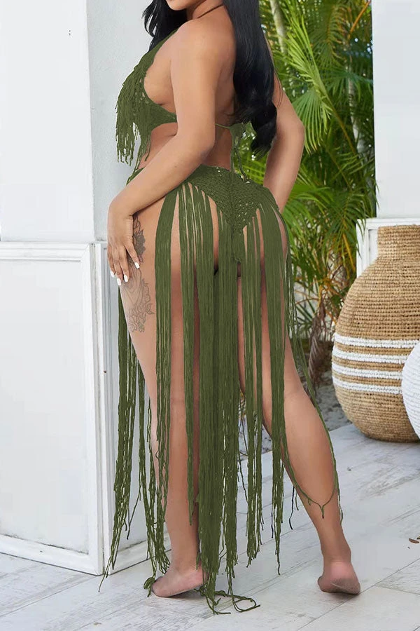 Solid Color Backless Romantic Crochet Cutout Tassel Beachwear